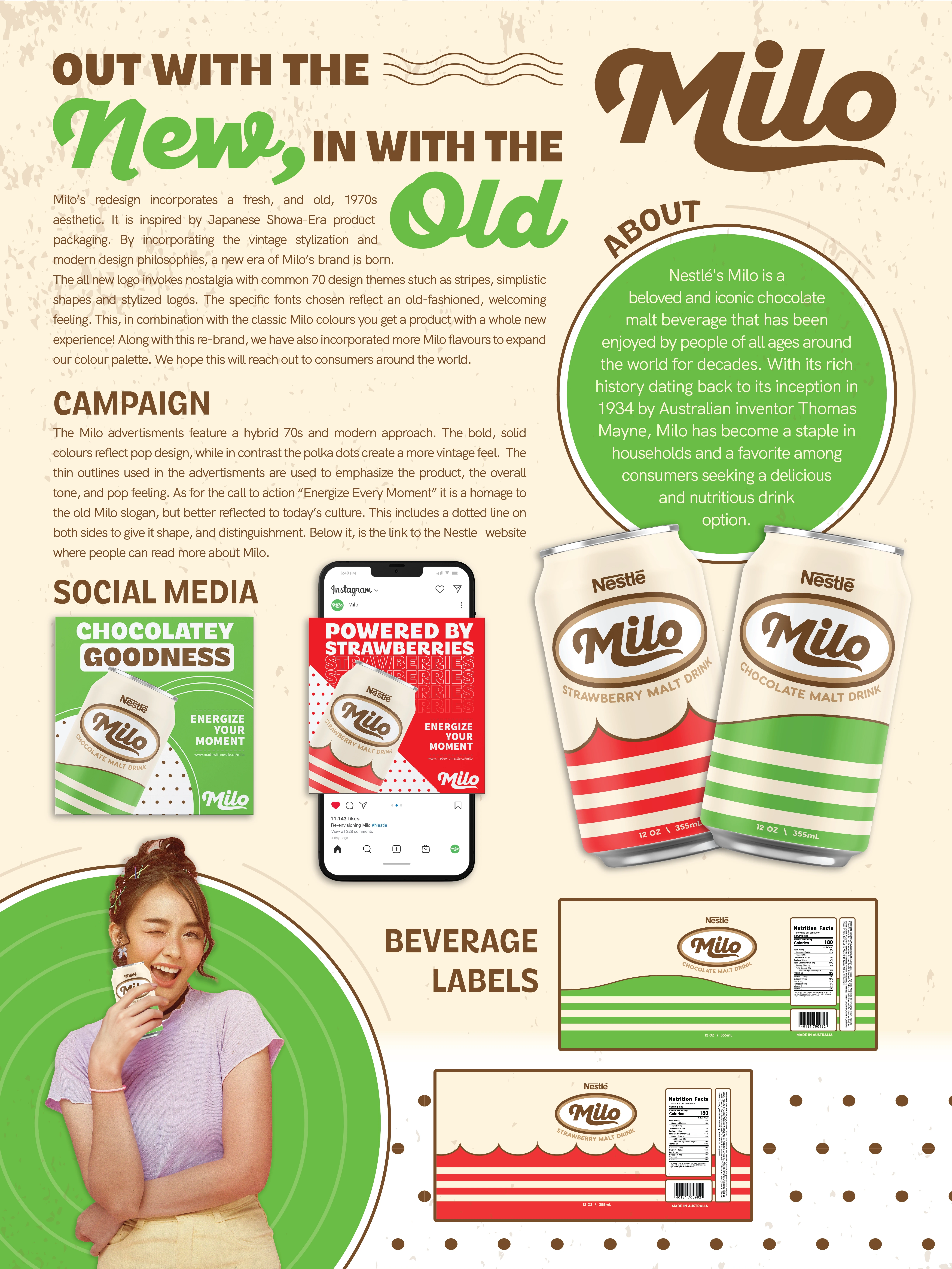 Tying everything together, here is the poster that showcases the inspiration behind the rebrand, a brief history of Milo, and the campaign vision. To reflect the 70s and Showa-era product design, I decided to include a person in the design to add more emotion and a sense of connection. This choice enhances the nostalgic feel and engages viewers on a personal level.