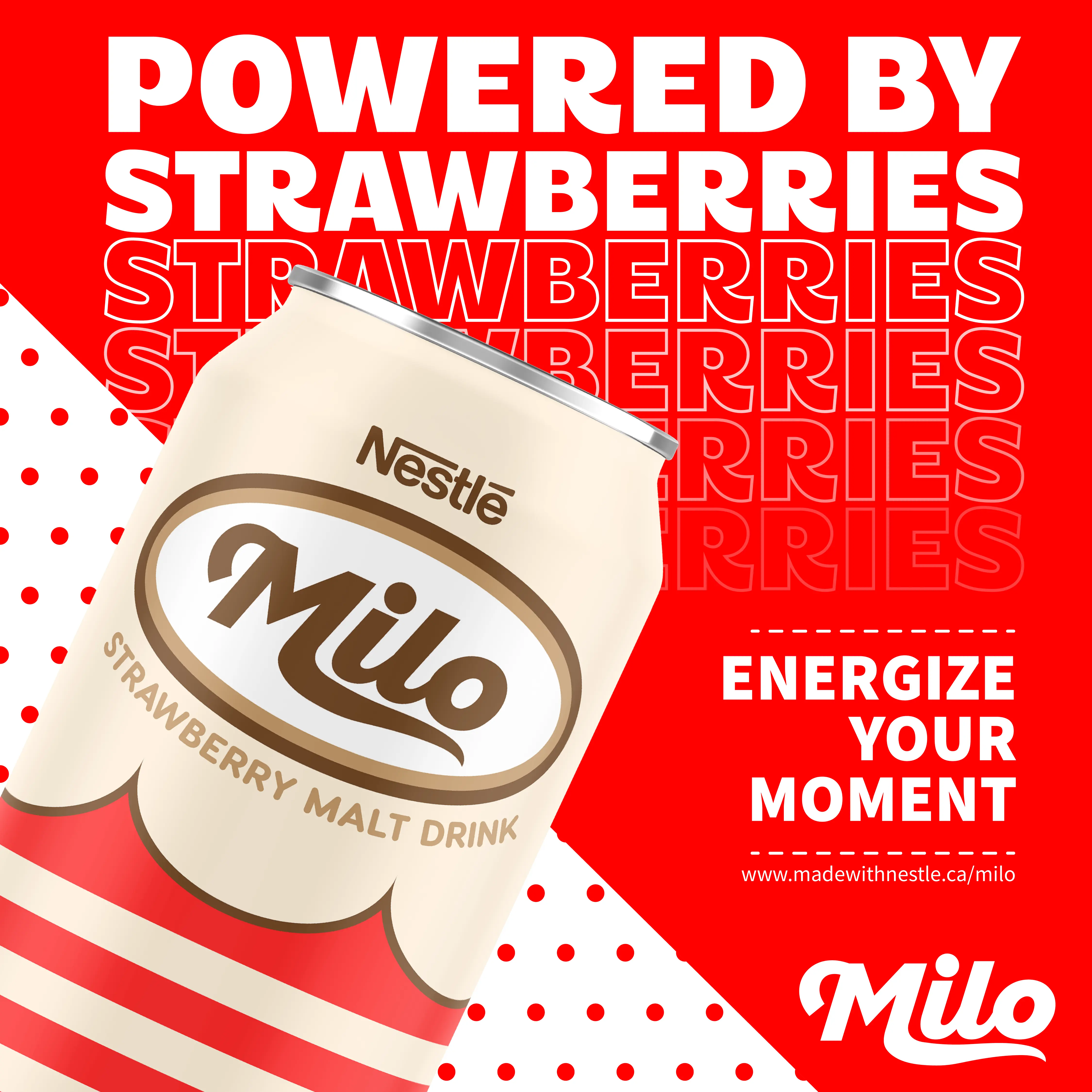 Alongside the original Milo drink, I created a hypothetical strawberry malt flavor for two reasons: first, to explore a new market, and second, because why not ¯\_(ツ)_/¯. I kept the same layout and design to maintain brand consistency and avoid confusing consumers. The only changes I made were to the colour and the 'wave' design, which I adjusted to subtly resemble strawberry leaves for added detail.